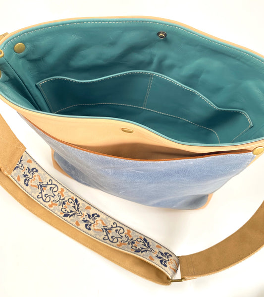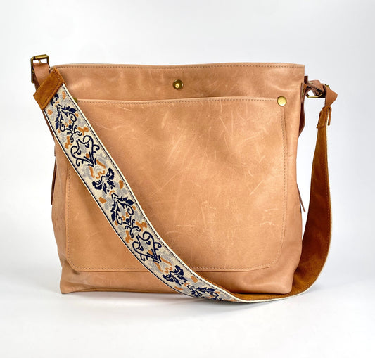 Honey Tan Leather Tote Bag with Suede Ribbon Strap