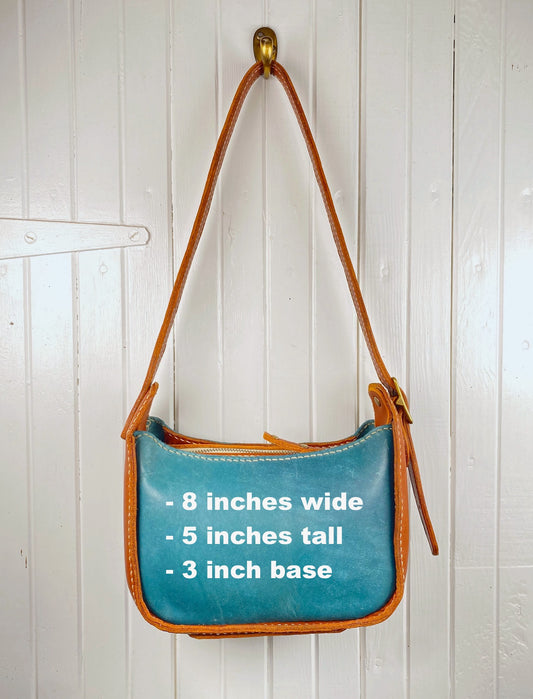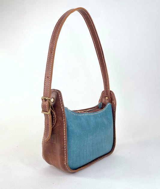 Lily 8 Compact Shoulder Bag Hand Stitched in Teal Blue and Tan